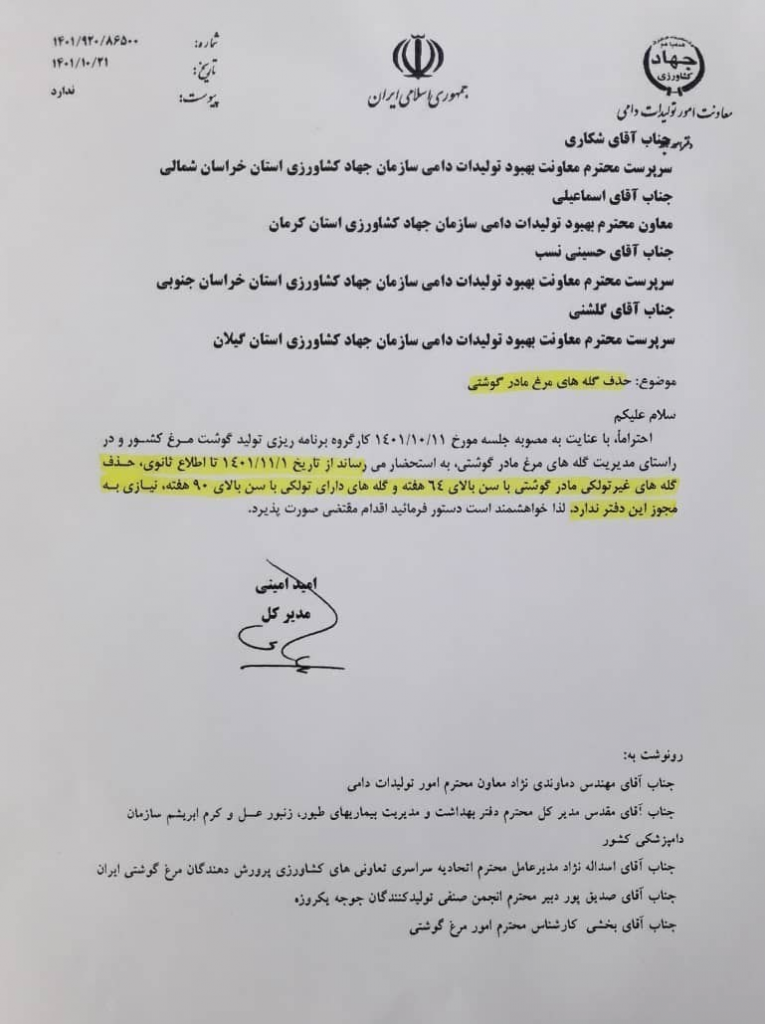 در بخشنامهای که از سوی معاونت امور دام به روسای سازمان های جهاد کشاورزی استان ها ابلاغ شده تاکید شده است با عنایت به مصوبه جلسه مورخ ۱۱ دی ماه ۱۴۰۱ کارگروه برنامه ریزی تولید گوشت مرغ در کشور و در راستای مدیریت گله های مرغ مادر گوشتی از تاریخ یک بهمن ماه ۱۴۰۱ تا اطلاع ثانوی حذف گله های غیر تولکی مادر گوشتی با سن بالای ۶۴ هفته و گله های دارای تولکی با سن بالای ۹۰ هفته نیازی به مجوز این دفتر ندارد.