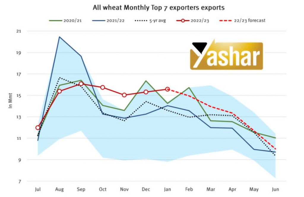 در زیر، روند صادرات ماهانه گندم را از ٧ صادر کننده اصلى گندم از سال ٢٠٢٠ و پیش بینى این روند در سال ٢٠٢٢/٢٠٢٣، بررسى میکنیم.