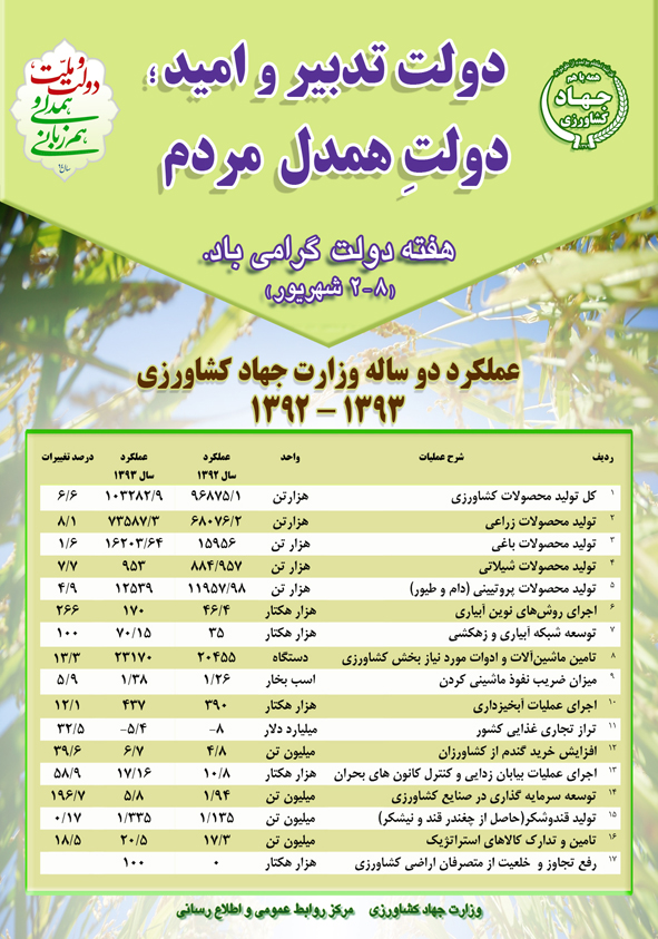 به گزارش پايگاه اطلاع رساني كشاورزي ايران(اگنا)، روابط عمومي وزارت جهاد كشاورزي خلاصه عملكرد دوسالانه وزارت جهاد كشاورزي را در قالب يك پوستر منتشر نمود.