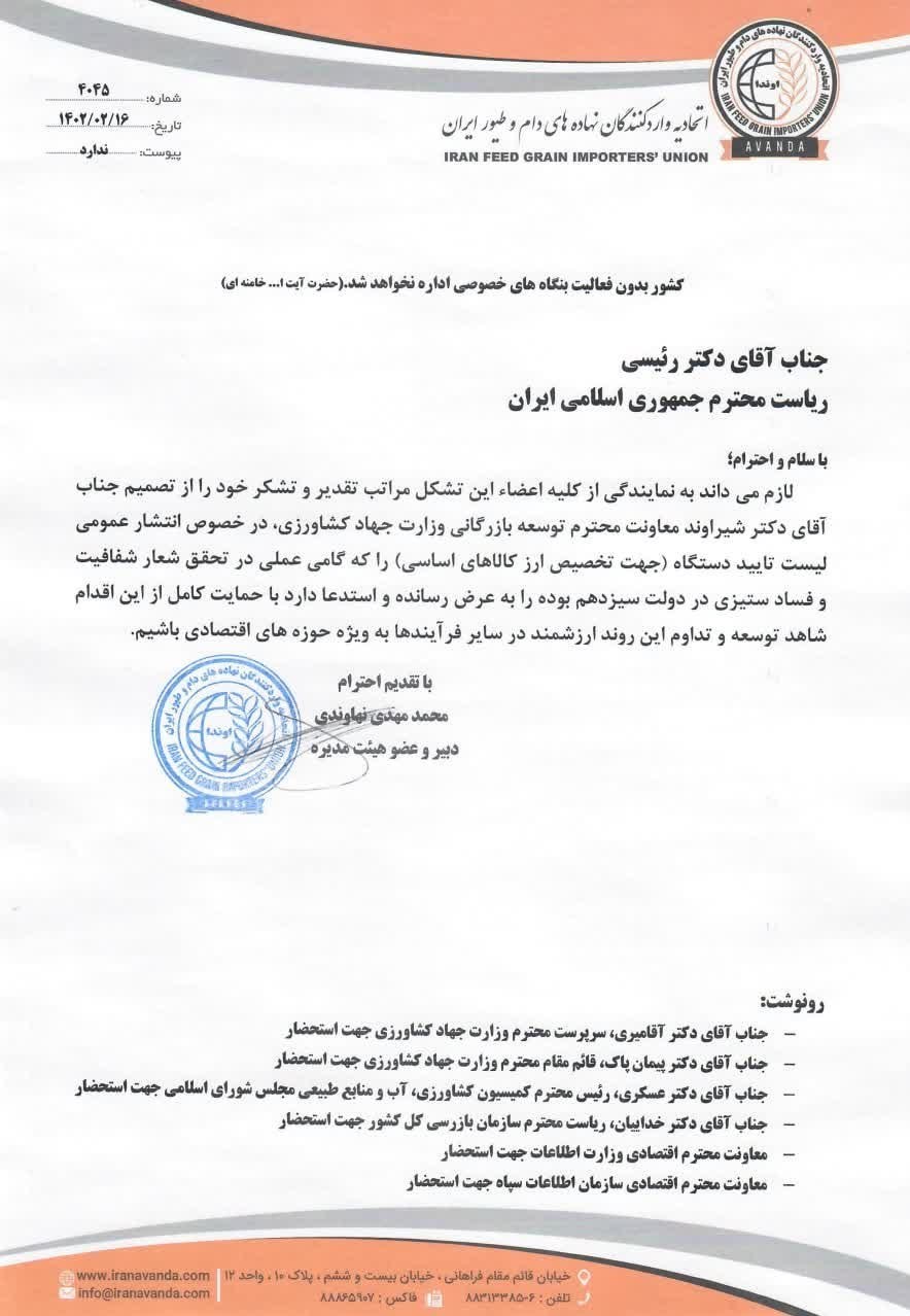 اتحادیه واردکنندگان نهادههای دام و طیور ایران در نامهای به رئیسجمهوری از اقدام وزارت کشاورزی در تحقق شعار شفافیت و فسادستیزی قدردانی کرد.