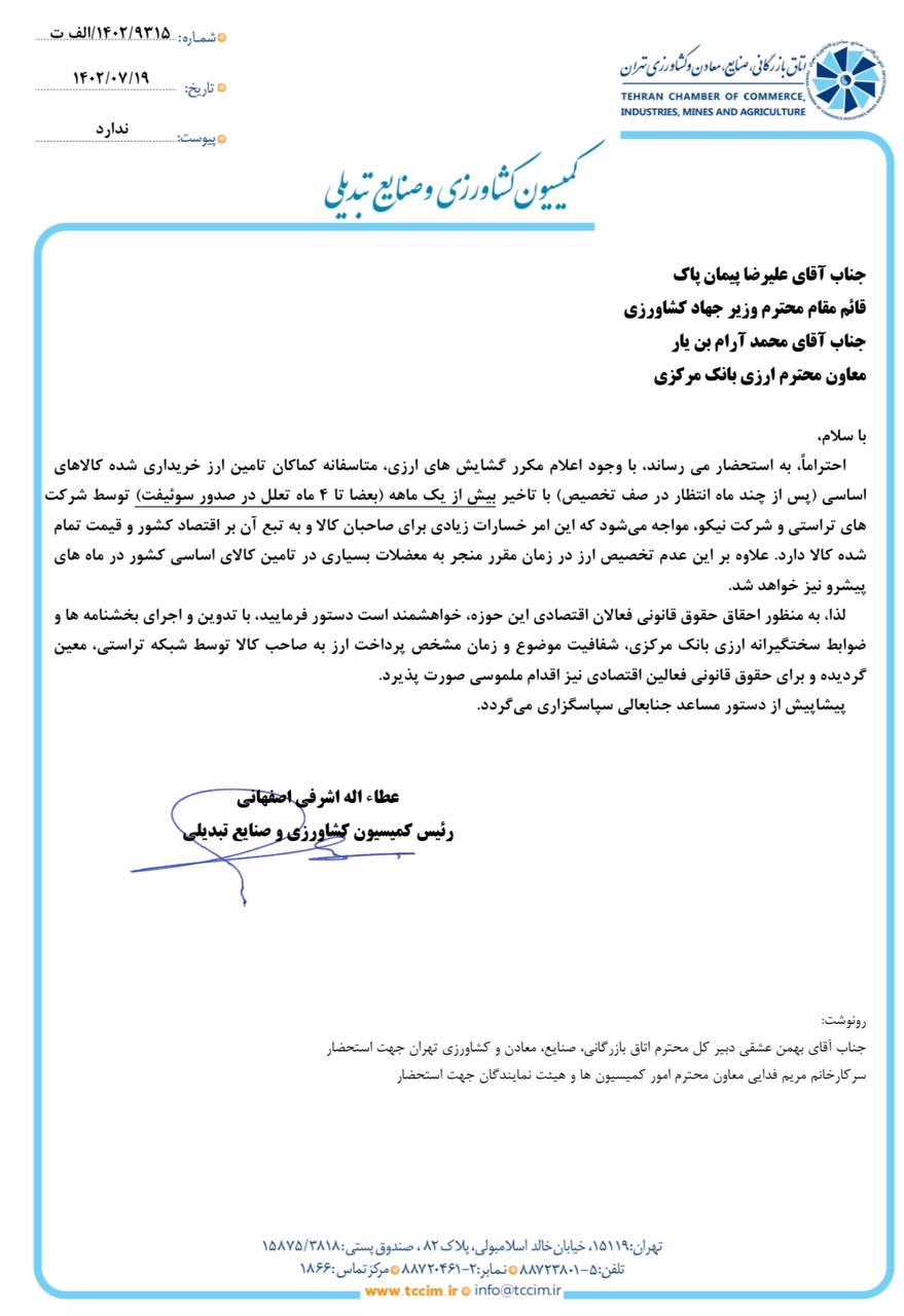 دکتر عطاءاله اشرفی اصفهانی رییس کمیسیون کشاورزی و صنایع تبدیلی اتاق بازرگانی تهران طی نامه ای به بانک مرکزی از بخشنامه ها و ضوابط سختگیرانه انتقاد نمود و درخواست کرد که ضمن تسریع در زمان پرداخت، شفافیت در موضوع زمان و پرداخت مشخص شود