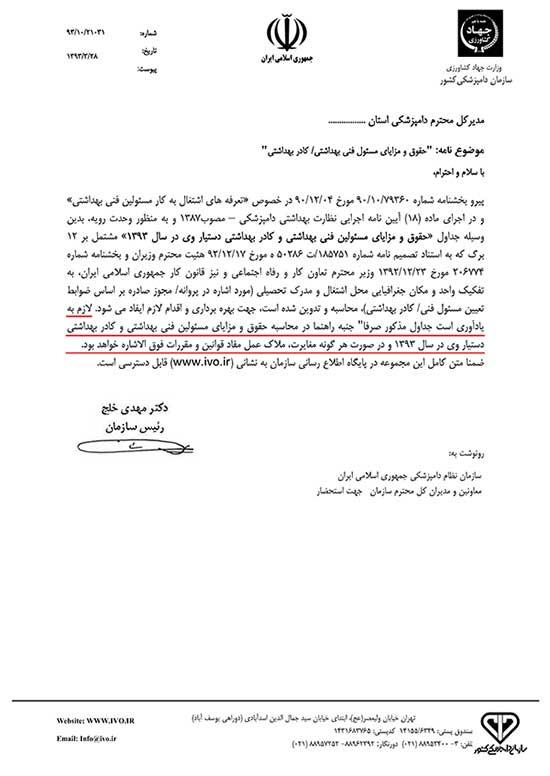 در ابلاغیه حقوق و مزایای مسئول فنی/کادر بهداشتی 3 سال گذشته (91، 92 و 93) سازمان دامپزشکی کشور به ادارات کل دامپزشکی آمده است: