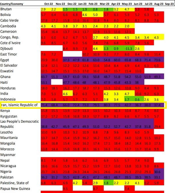بر اساس این گزارش، تورم مواد غذایی در ایران در ۱۲ ماهه منتهی به آگوست ۲۰۲۳ یعنی مرداد ماه امسال ۳۸ درصد برآورد شده است.