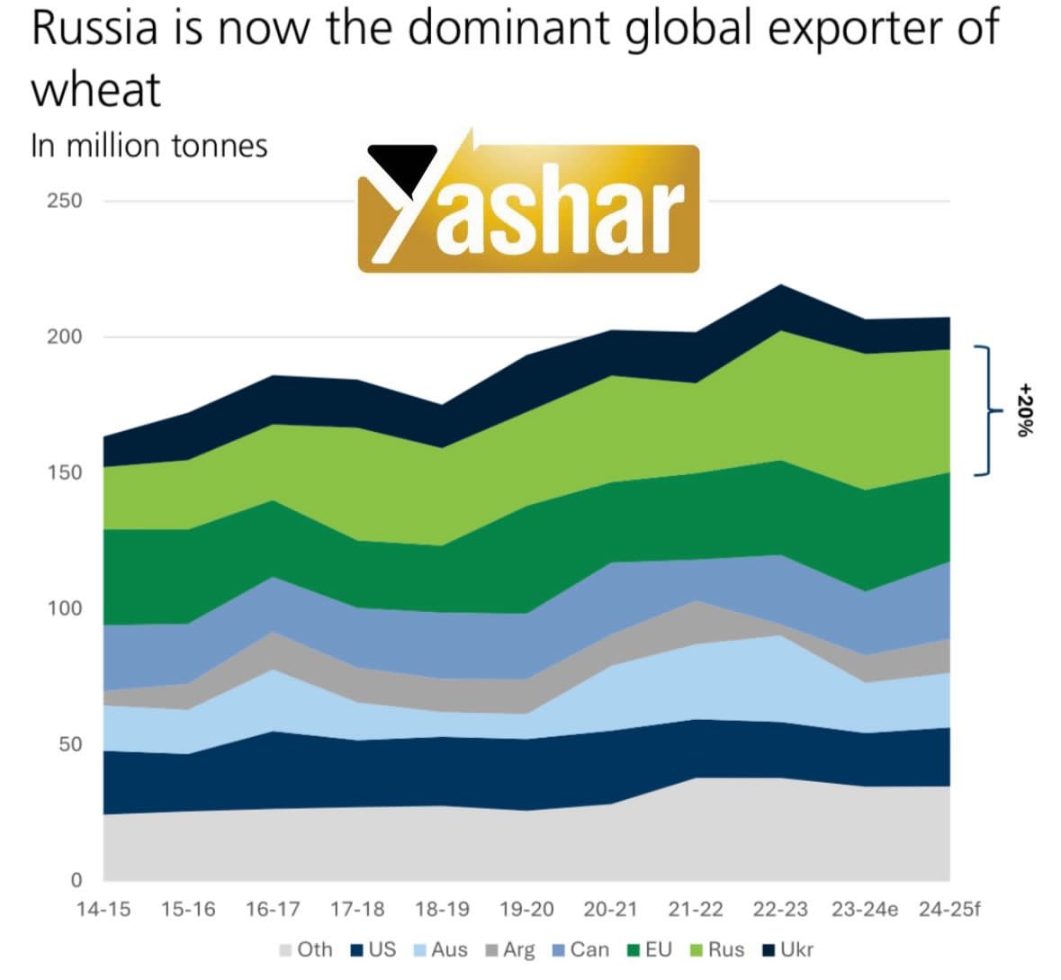 علیرغم انصراف دولت آرژانتین با توجه به سیاست هاى جدید دولت در عضویت در بریکس، کماکان انتظار می رود که تأثیر کشورهاى عضو بریکس بر بازار جهانی غلات بیشتر تقویت شده و تأثیر جمعی این کشورها بر تولید و مصرف جهانی غلات قابل توجه باشد. در زیر، سهم بازار صادرات گندم کشورهاى مختلف را طى ١٠ سال، بررسى میکنیم. روسیه، کماکان بیشترین سهم بازار صادرات گندم دنیا را در دست دارد.