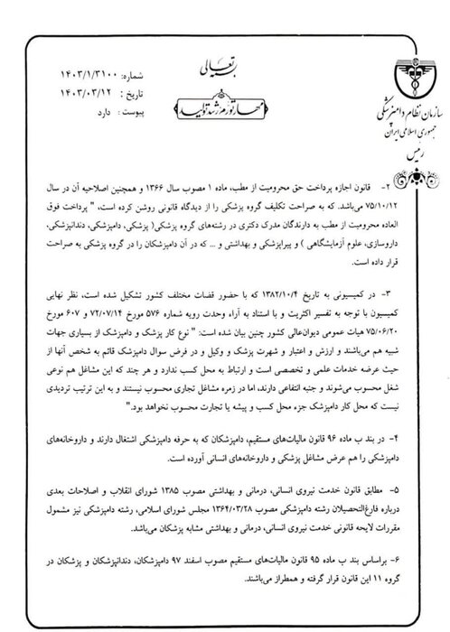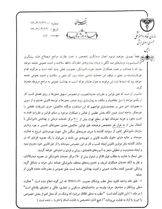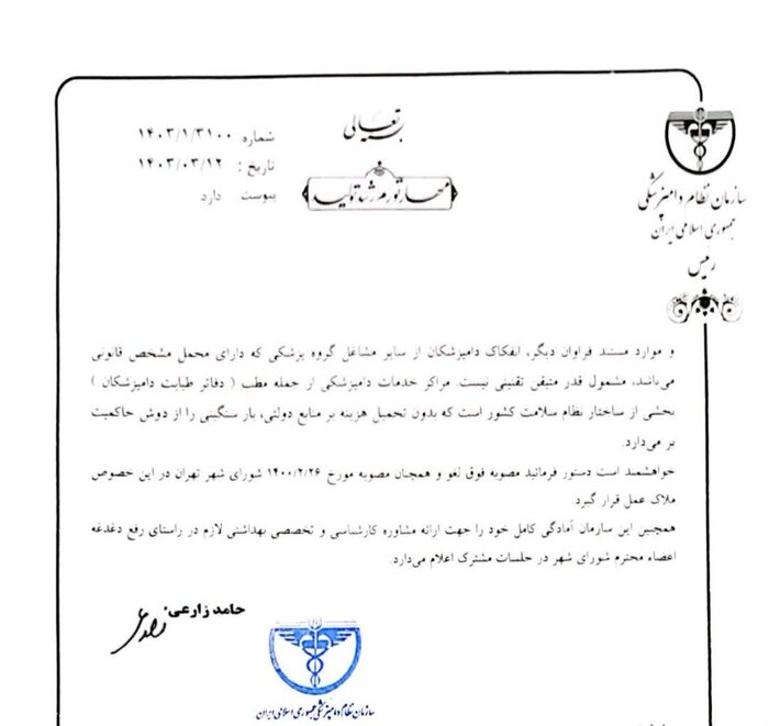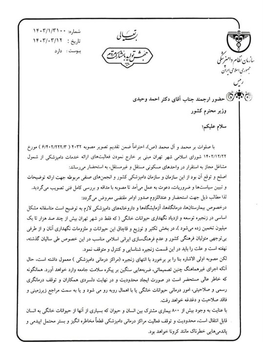 رئیس سازمان نظام دامپزشکی کشور خواستار لغو مصوبه اخیر شورای شهر تهران مبنی بر خارج کردن فعالیتهای ارائه خدمات دامپزشکی از شمول مشاغل مجاز به استقرار در واحدهای مسکونی مستقل و غیرمستقل شد.