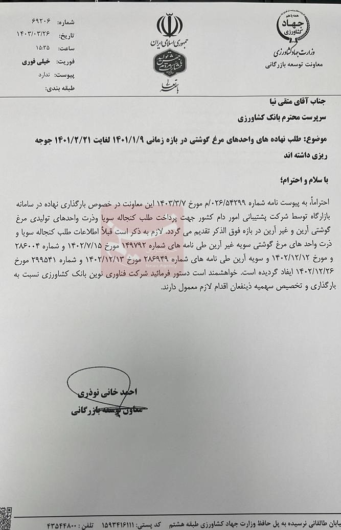 به گزراش پایگاه اطلاع رسانی کشاورزی ایران (اگنا)؛ به نقل از تسنیم دستور بارگذاری طلب نهاده های واحد های مرغ گوشتی در بازه زمانی ۹ فروردین ۱۴۰۱ لغایت ۲۱ اردیبهشت ۱۴۰۱ توسط معاون توسعه بازرگانی وزارت جهاد کشاورزی در نامه به بانک کشاورزی صادر شد.