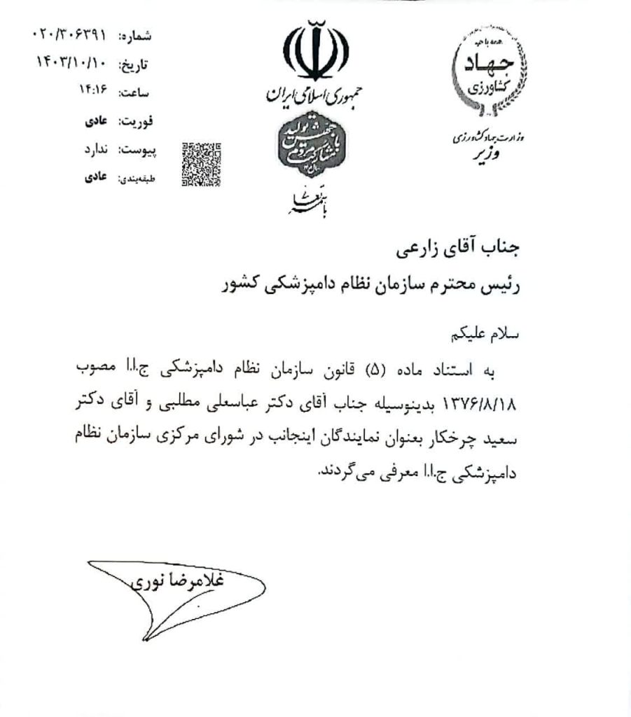به گزارش پایگاه اطلاع رسانی کشاورزی و صنایع غذایی ایران (اگنا)؛ غلامرضا نوری قزلجه وزیر جهاد کشاورزی با ارسال نامه ای به رییس سازمان نظام دامپزشکی کشور آقایان عباسعلی مطلبی و سعید چرخکار را بعنوان نمایندگان خود در شورای مرکزی سازمان نظام دامپزشکی جمهوری اسلامی ایران معرفی نمود.