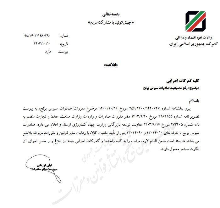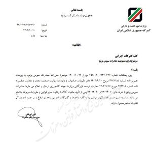 سرپرست دفتر صادرات گمرک جمهوری اسلامی ایران رفع ممنوعیت صادرات سبوس برنج را ابلاغ کرد.
