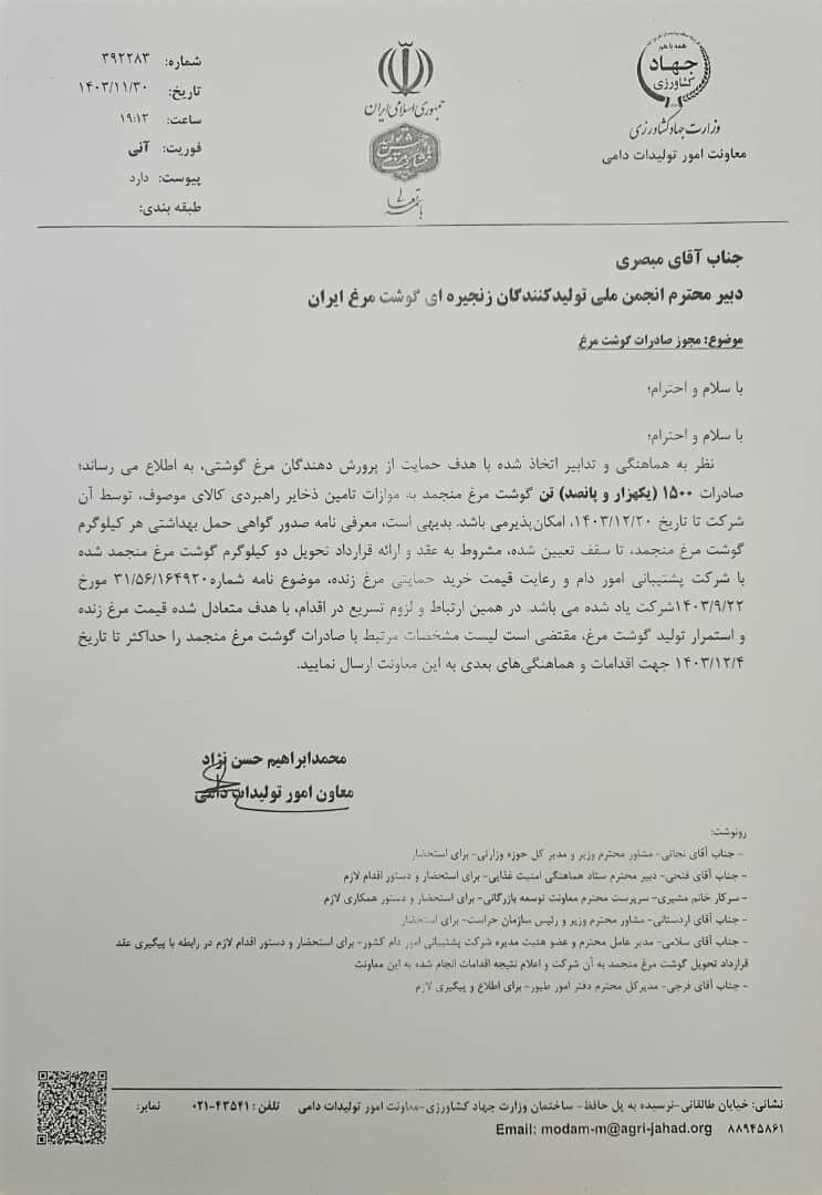 .محمد ابراهیم حسن نژاد در این نامه عنوان کرده است، نظر به هماهنگی و تدابیر اتخاذ شده و با هدف حمایت از پرورش دهندگان مرغ گوشتی به اطلاع میرساند، صادرات ۱۵۰۰ تن گوشت مرغ منجمد به موازات تأمین ذخایر راهبردی کالای موصوف توسط آن شرکت تا ۲۰ اسفند ماه ۱۴۰۳ امکان پذیر است.