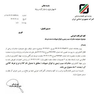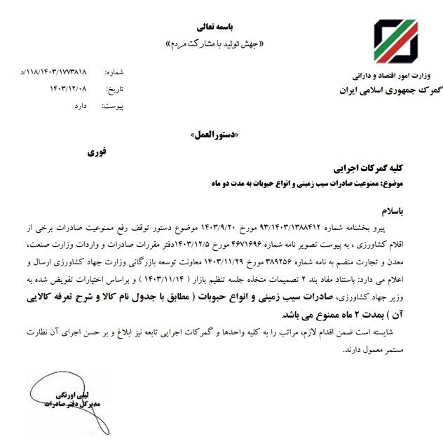 باستناد مفاد بند ٢ تصمیمات متخذه جلسه تنظیم بازار ( ۱۴۰۳/۱۱/۱۴ ) و براساس اختیارات تفویض شده به وزیر جهاد کشاورزی، صادرات سیب زمینی و انواع حبوبات ( مطابق با جدول نام کالا و شرح تعرفه کالایی آن ) بمدت ۲ ماه ممنوع می باشد. شایسته است ضمن اقدام لازم، مراتب را به کلیه واحدها و گمرکات اجرایی تابعه نیز ابلاغ و بر حسن اجرای آن نظارت مستمرمعمول دارند.