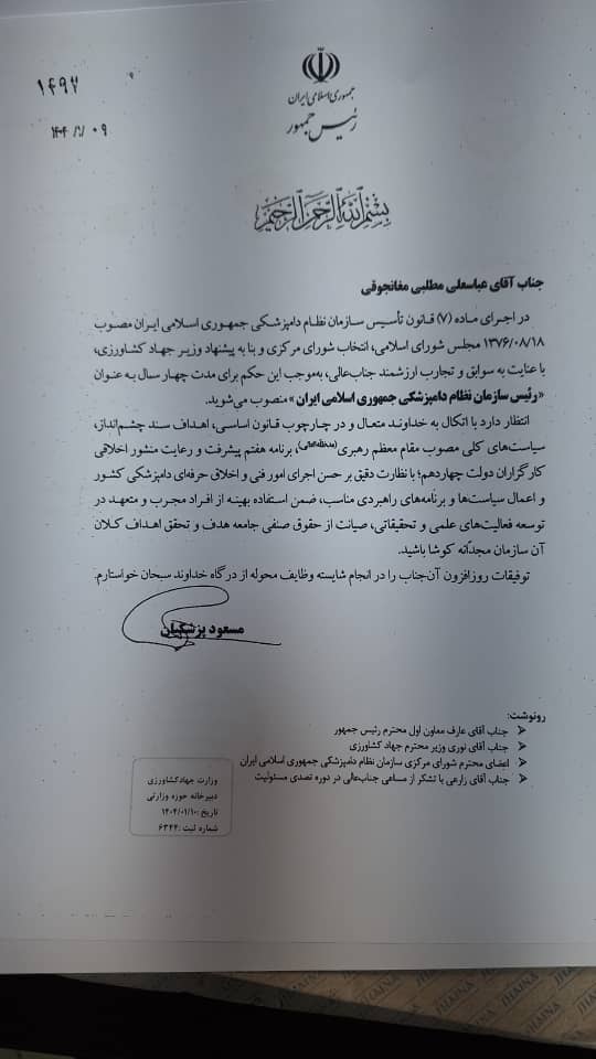 در این حکم آمده است در اجرای ماده ۷ قانون تاسیس نظام دامپزشکی جمهوری اسلامی ایران مصوب ۱۳۷۶/۰۸/۱۸مجلس شورای اسلامی انتخاب شورای مرکزی و بنا به پیشنهاد وزیر جهاد کشاورزی ،با عنایت به سوابق و تجارب ارزشمند جنابعالی به موجب این حکم برای مدت چهار سال بعنوان رییس سازمان نظام دامپزشکی جمهوری اسلامی ایران منصوب می شوید.