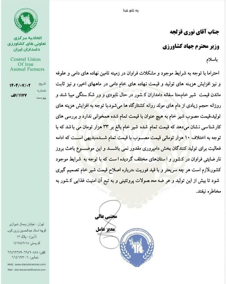 متن درخواست اتحادیه مرکزی دامداران ایران در خصوص اصلاح فوری قیمت شیر خام