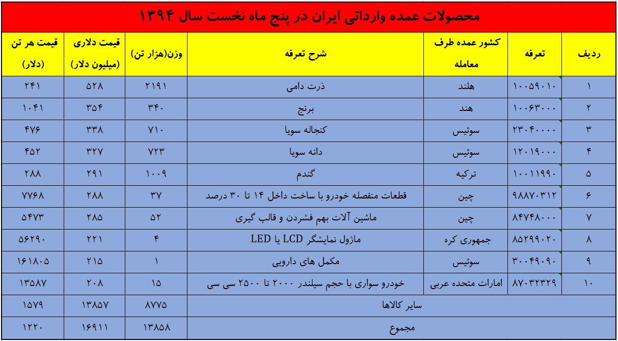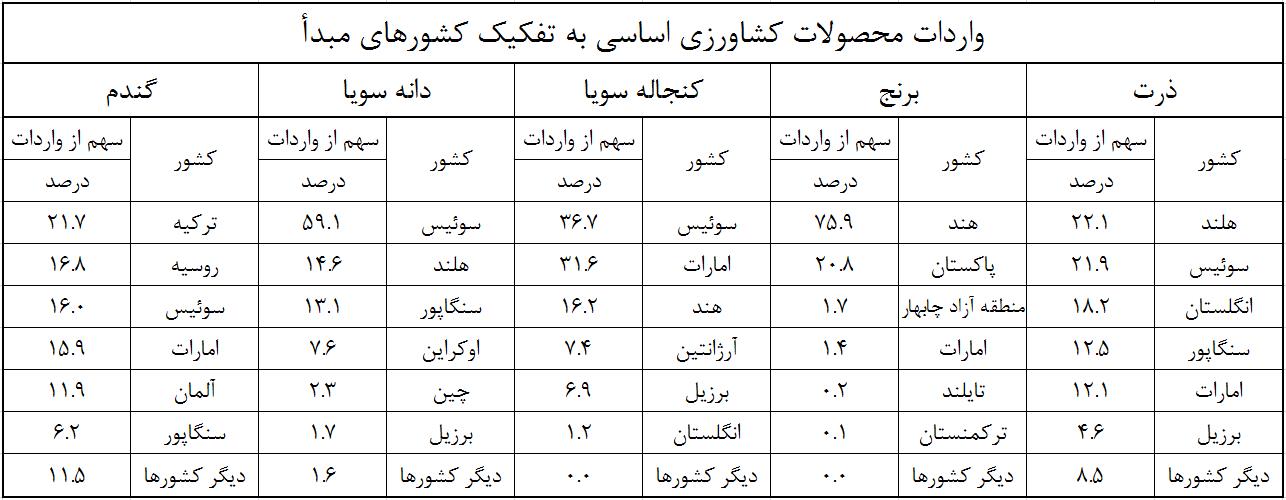 اما نکته قابل توجه مبادی وارداتی عمده محصولات اساسی کشور است به طوریکه در ۵ کالاهای اساسی که در صدر واردات کشور قرار دارند کشورهایی چون هلند، سوئیس و ترکیه در صدر مبادی وارداتی قرار دارند. در جدول زیر مبادی عمده وارداتی هریک از این ۵ محصول نشان داده شده است.