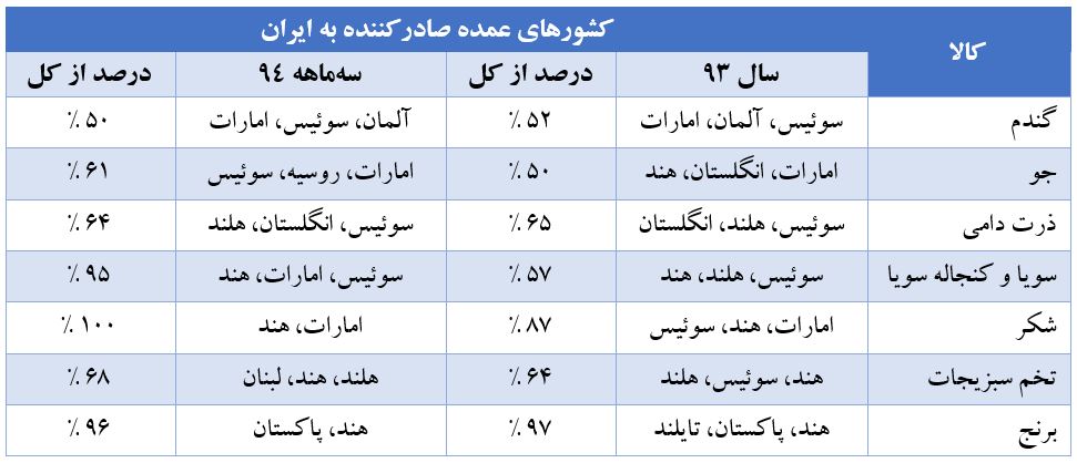با توجه به آمارهای مرکز گمرک، برخی کشورها مانند سوئیس، آلمان، انگلستان و هلند سهم اصلی تأمین محصولات اساسی وارداتی در سال ۹۳ و سهماهه سال ۹۴ را دارند. هرچند در انتخاب مبادی واردات باید ابعاد اقتصادی را مدنظر قرار داد، اما توجه به مسائل راهبردی نیز در این موضوع بسیار حائز اهمیت است.